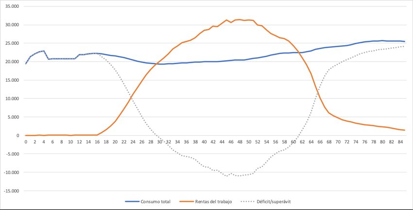 En cambio, entre aproximadamente los 30 y los 60 años se produce una etapa de superávit. En este periodo las rentas laborales superan el nivel de consumo, lo que permite tanto el ahorro individual como la financiación indirecta del consumo de otros grupos de edad, especialmente los más jóvenes y los mayores.