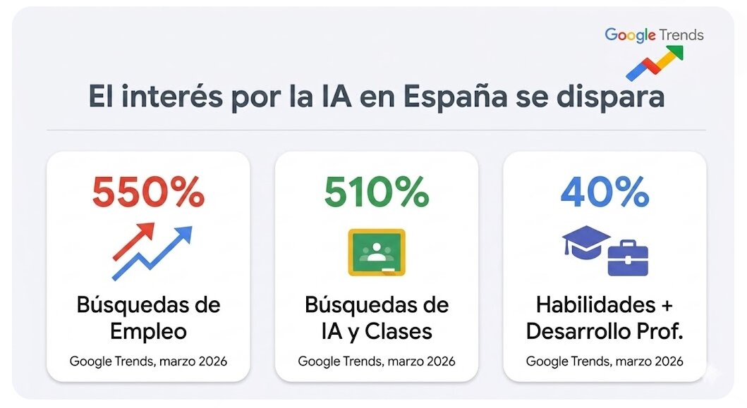 La Inteligencia Artificial ha dejado de ser una promesa de futuro para convertirse en el motor principal de la búsqueda de empleo y la formación en España. Según los últimos datos de Google correspondientes a marzo de 2026, las consultas relacionadas con puestos de trabajo vinculados a esta tecnología han experimentado un crecimiento sin precedentes del 550% en el último año. Este fenómeno refleja un cambio estructural en el mercado laboral, donde el interés por la recualificación profesional o upskilling ha elevado un 40% las búsquedas que combinan el desarrollo de nuevas habilidades con el crecimiento de la carrera profesional.