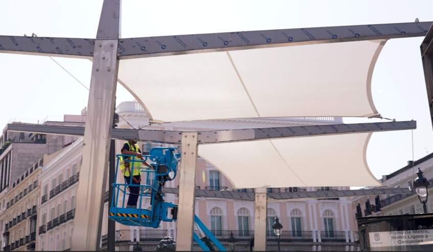 Los toldos de la Puerta del Sol se estrenaron este verano como parte de un plan municipal para reducir la temperatura ambiental y ofrecer sombra a los miles de peatones que atraviesan diariamente el emblemático enclave.