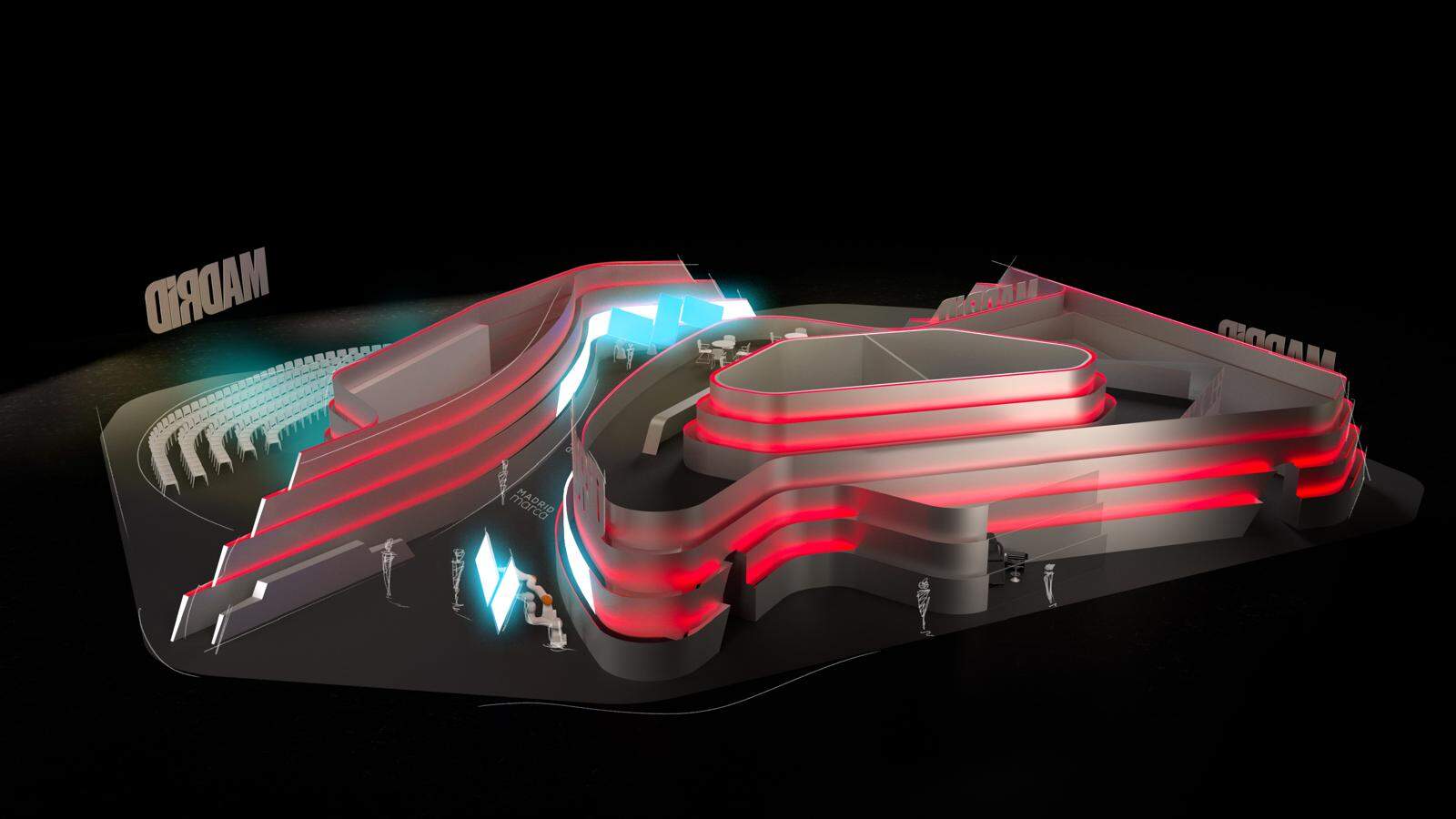El espacio expositivo, de 1.448 metros cuadrados compartidos con el Ayuntamiento de Madrid, presenta una estética curva y acabado metálico que recrea los carriles por los que circularán los monoplazas en MadRing, mientras que su planta reproduce el trazado del futuro circuito. Construido en acero, el diseño pretende transmitir tecnología y modernidad, al tiempo que dialoga con las líneas arquitectónicas del Santiago Bernabéu y el Riyadh Air Metropolitano, dos iconos deportivos de la capital. Un sistema de iluminación LED cambiante y pantallas suspendidas en brazos robóticos coreografiados completan una puesta en escena altamente sensorial.