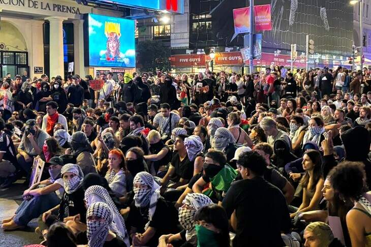 Los agentes no realizaron cargas, aunque bajaron las viseras de sus cascos y prepararon defensas ante posibles enfrentamientos. Finalmente, varios manifestantes se sentaron en el suelo, levantaron las manos y guardaron un minuto de silencio por las víctimas de Gaza, mientras coreaban nuevas consignas por la “libertad del pueblo palestino”.