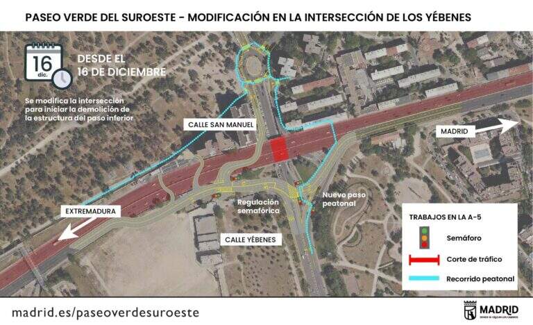 Las obras del Paseo Verde del Suroeste avanzan en una nueva fase que implicará cambios significativos en la movilidad del entorno de Los Yébenes. A partir del martes 16 de diciembre, el Ayuntamiento de Madrid modificará la actual intersección situada bajo la A-5, con el objetivo de demoler la estructura existente en la calle San Manuel y continuar con la excavación bajo losa prevista en el proyecto.