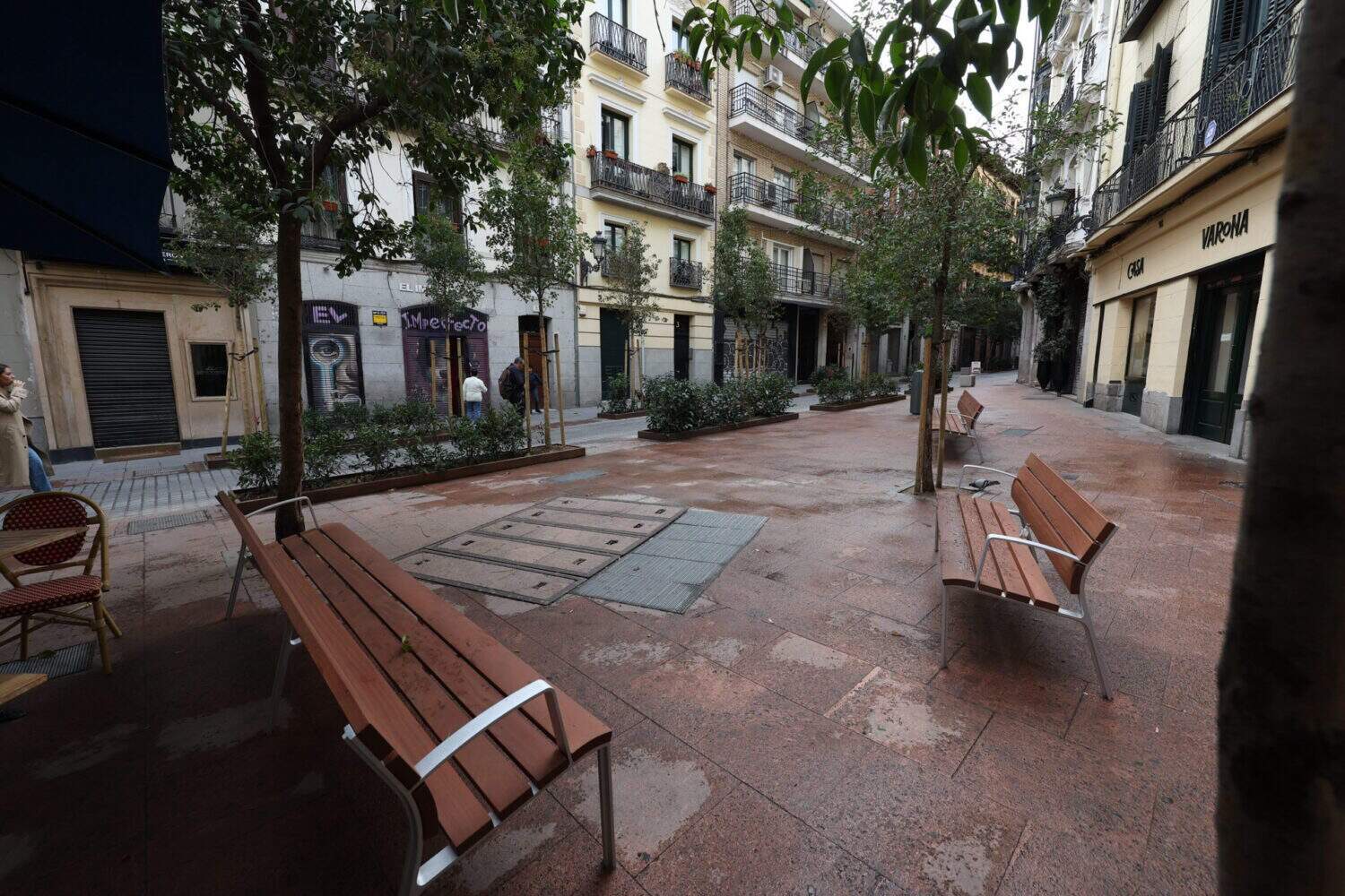 La reforma, con una inversión de 1 millón de euros, renueva pavimentos, mobiliario y arbolado en el corazón del barrio de las Letras