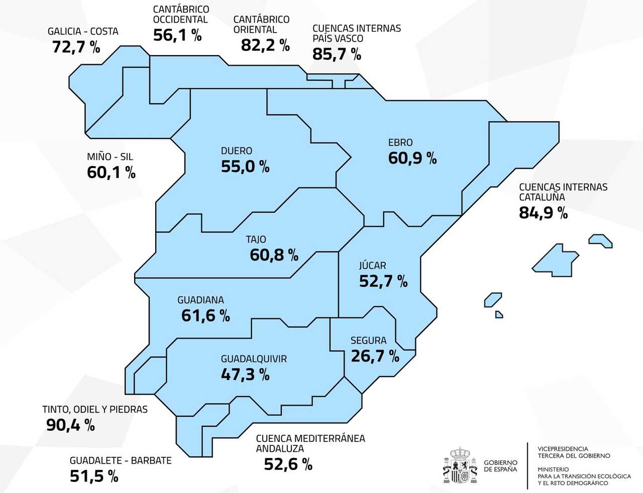 Los niveles más altos se encuentran en las cuencas del Tinto, Odiel y Piedras, con un 90,4% de agua embalsada, seguidas por las cuencas internas del País Vasco (85,7%), Cataluña (85,9%) y el Cantábrico Oriental (82,2%). Otras cuencas con reservas significativas son Galicia Costa (72,7%), Guadiana (61,6%), Ebro (60,9%) y Tajo (60,8%). En contraste, el Segura presenta la reserva más baja, con apenas un 26,7% de su capacidad.