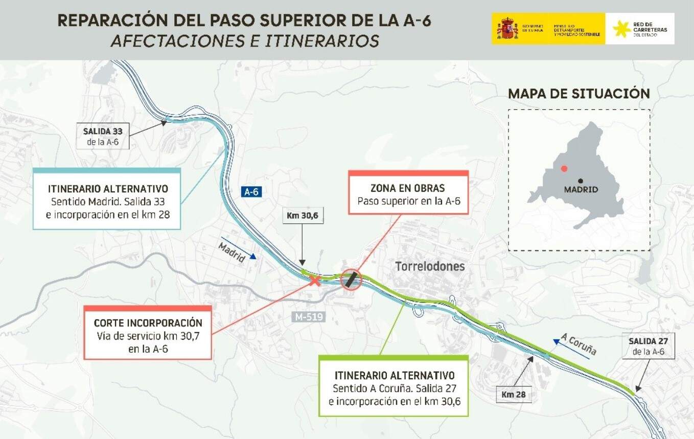 La autovía A-6 permanecerá cerrada por completo en ambos sentidos esta noche, desde las 23:00 horas del miércoles hasta las 6:00 del jueves, debido a los trabajos de reparación del paso superior situado en el kilómetro 30,2, que conecta con Torrelodones Colonia a través de la M-519. La medida forma parte del proyecto de mejora que ejecuta el Ministerio de Transportes y Movilidad Sostenible, con una inversión de 4,04 millones de euros.