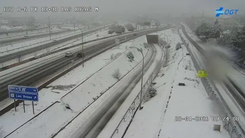 Uno de los ejes más afectados. Nieve desde Madrid hasta Somosierra y conexión con Segovia, con circulación difícil o irregular, pavimento deslizante y prohibición de paso a camiones, autobuses y articulados en varios tramos.