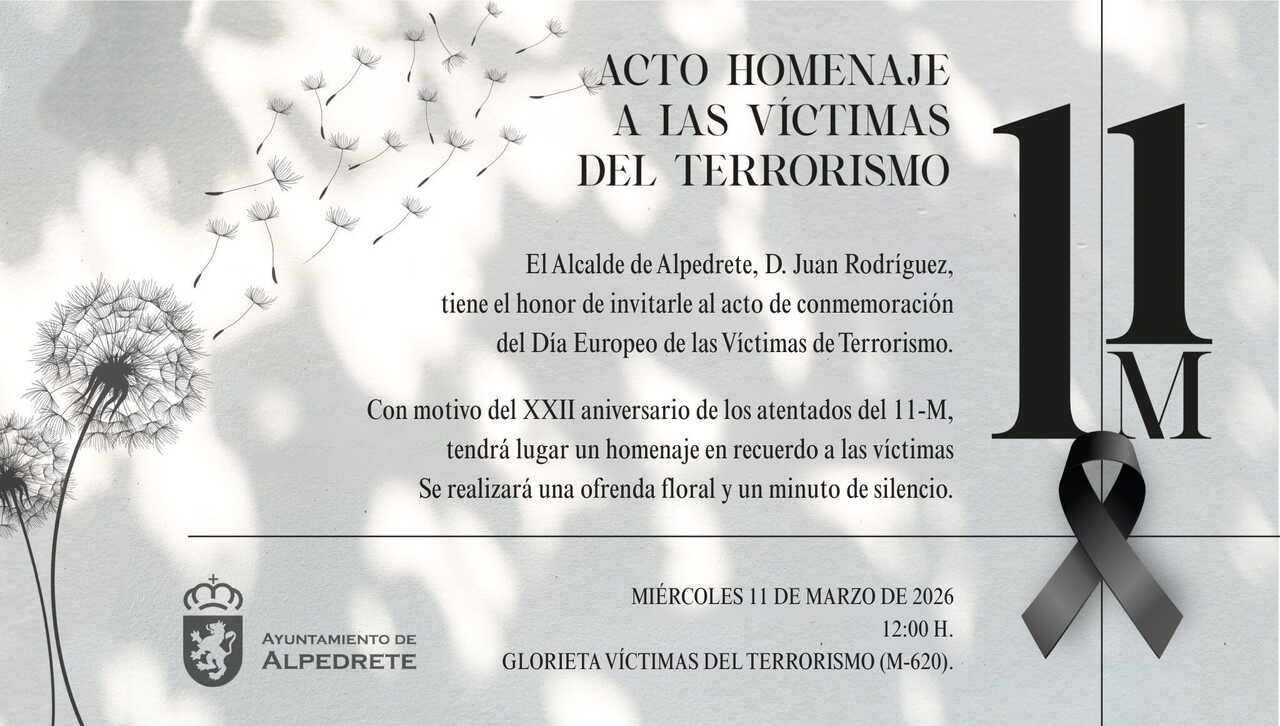 El Ayuntamiento de Alpedrete ha convocado un acto institucional para este miércoles 11 de marzo con el fin de honrar la memoria de las víctimas de los atentados de 2004. La conmemoración, que coincide con el 22º aniversario de los ataques en Madrid, se enmarca también en el Día Europeo en Memoria de las Víctimas del Terrorismo, una efeméride instaurada por la Comisión Europea para garantizar que el recuerdo y el reconocimiento a quienes sufrieron la violencia terrorista permanezcan vigentes en la sociedad.