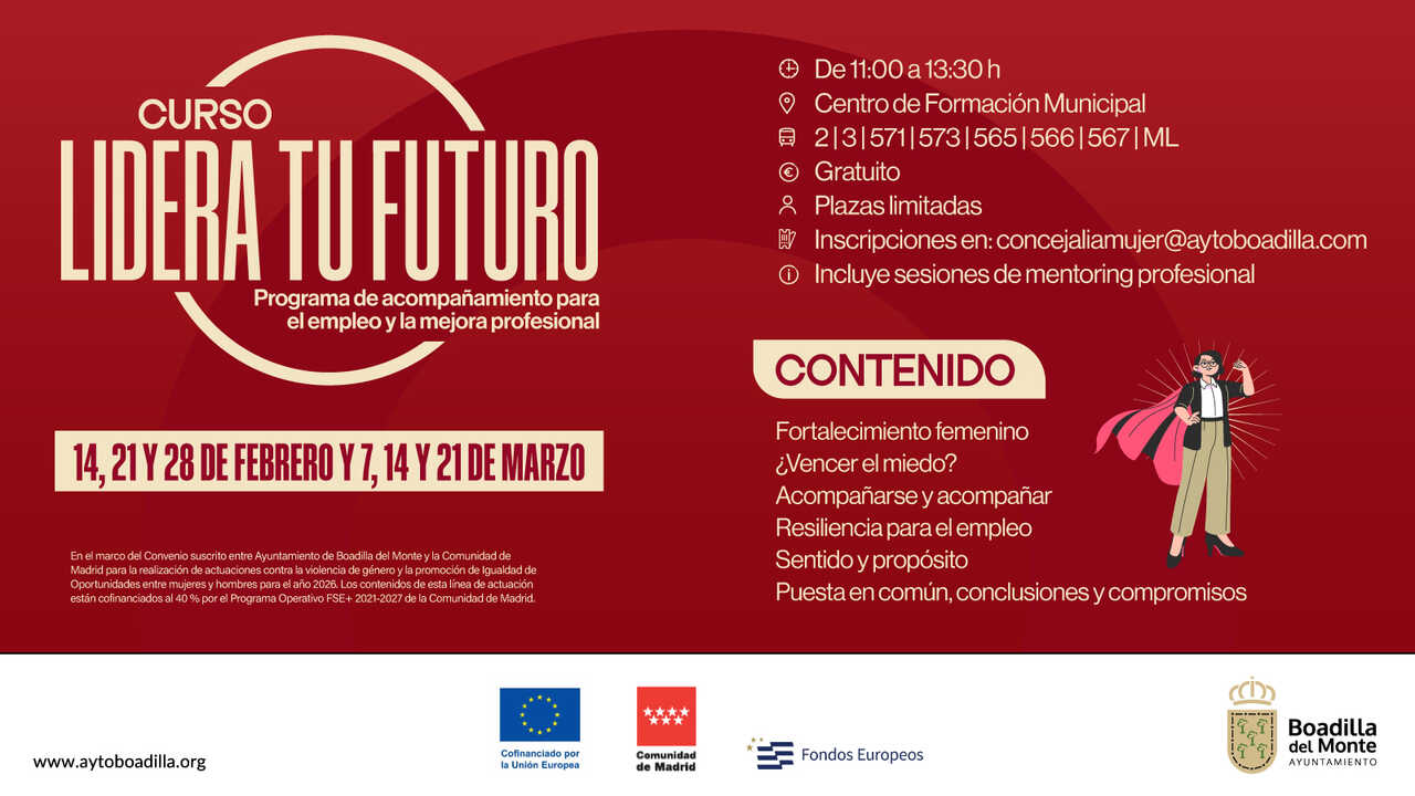El Ayuntamiento de Boadilla del Monte ha puesto en marcha el curso "Lidera tu futuro", un programa de acompañamiento para la búsqueda de empleo y la mejora profesional dirigido a mujeres, que se impartirá en seis sesiones entre febrero y marzo en el Centro de Formación Municipal, en el marco de acciones para promover la igualdad de oportunidades entre mujeres y hombres.
