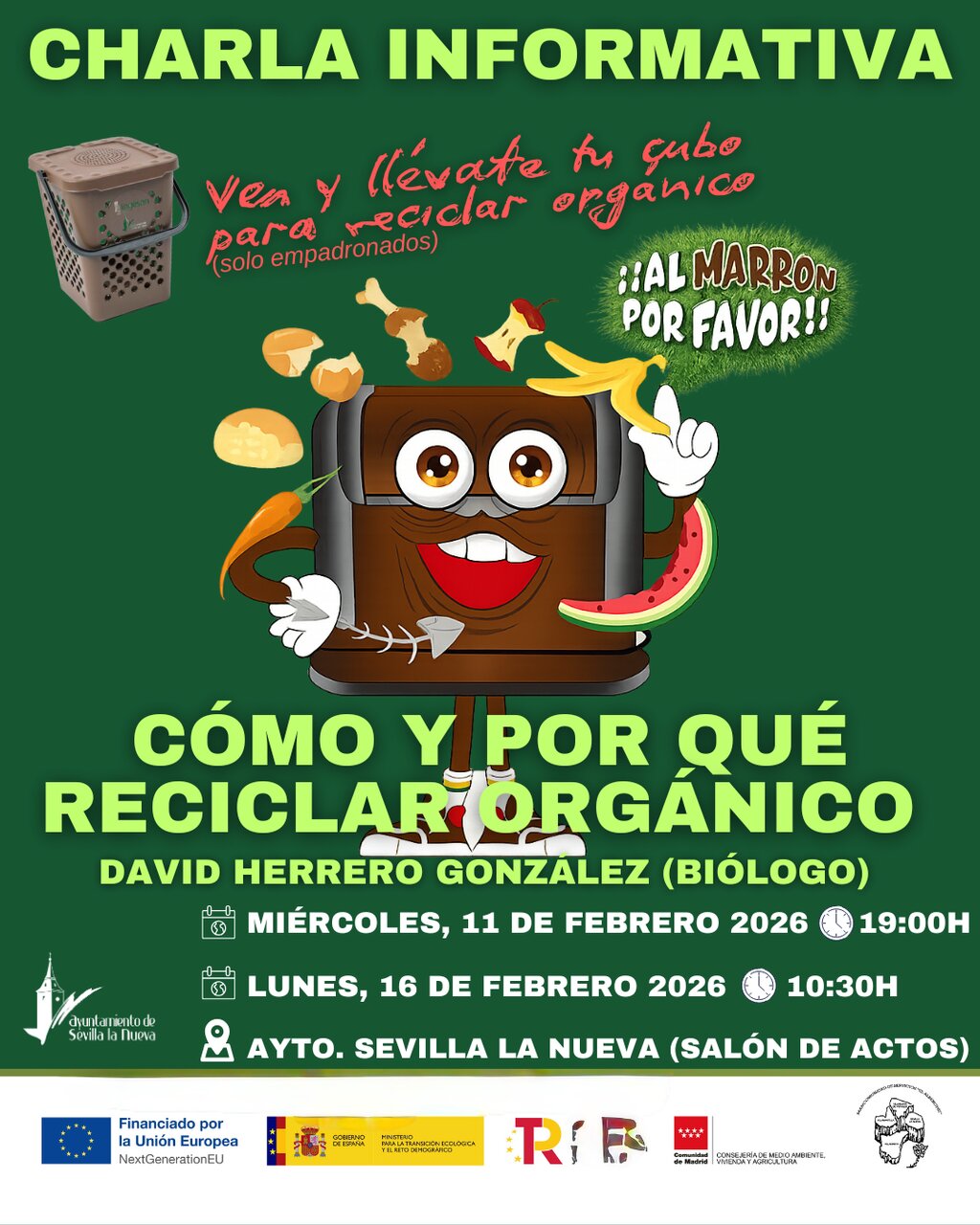 El Ayuntamiento de Sevilla La Nueva continúa promoviendo la separación correcta de los residuos orgánicos con nuevas acciones de sensibilización ciudadana. En el marco de la campaña municipal para fomentar el uso del contenedor marrón, se celebrarán dos charlas informativas abiertas a todos los vecinos del municipio.