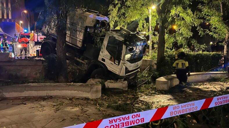 Accidente sin heridos en Madrid: un camión municipal se precipita por la cuesta de la Vega