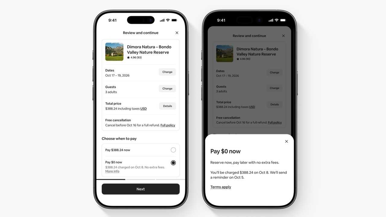 La funcionalidad "Reserva ahora y paga después" está disponible en anuncios elegibles en todo el mundo, incluidos aquellos con políticas de cancelación moderada o flexible. Los requisitos no alteran las políticas de cancelación que los anfitriones hayan seleccionado, y los viajeros todavía deben completar el pago antes de que finalice el plazo gratuito de cancelación para que la reserva se confirme de forma definitiva.